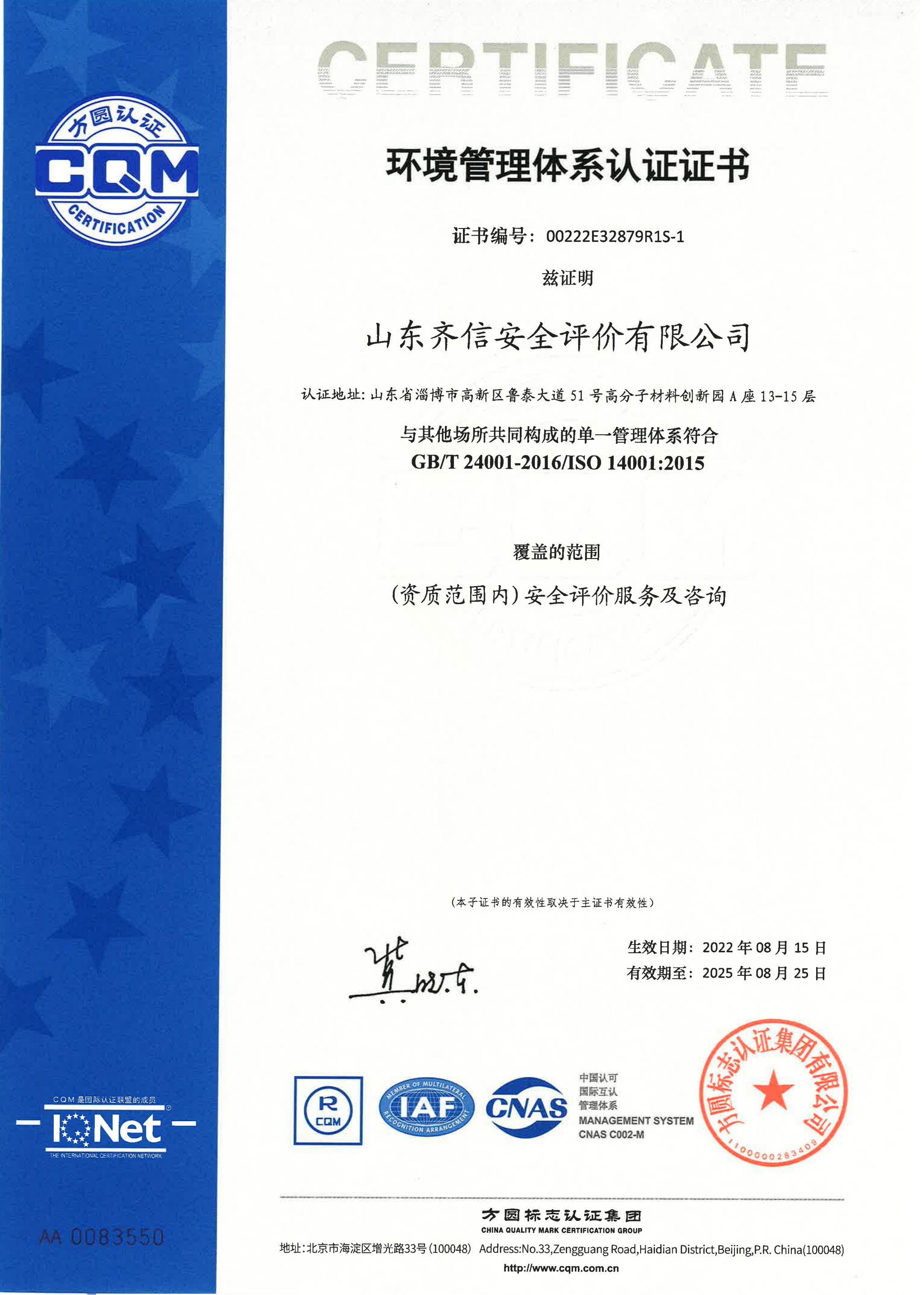 環(huán)境管理體系認(rèn)證證書